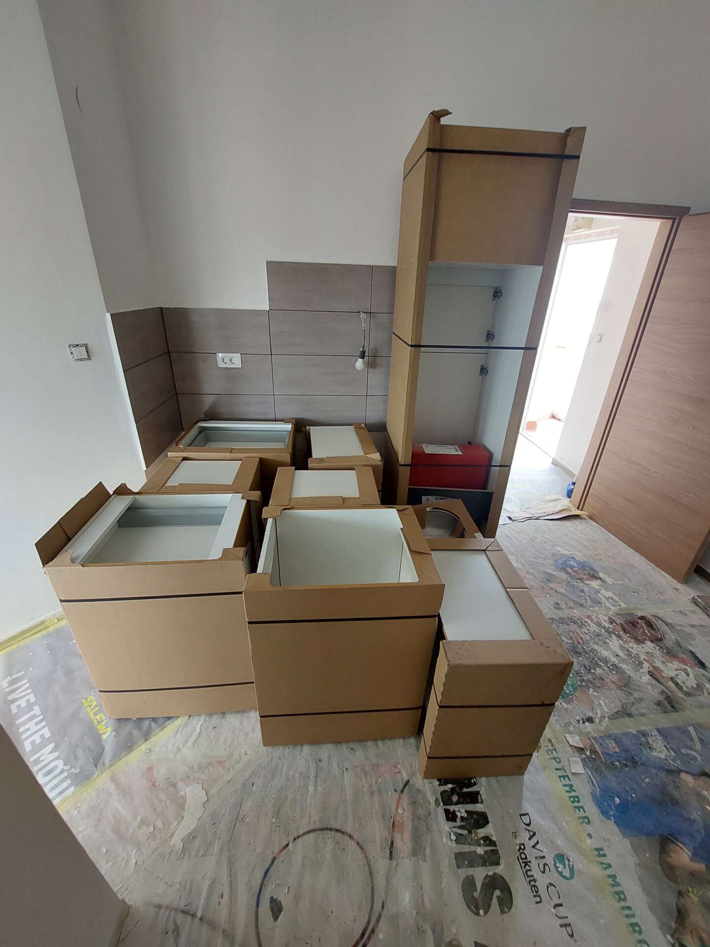 We remove your old kitchen and package it; we remove the appliances and load them into the goods vehicle. At the new location, the kitchen is reinstalled, and the appliances are set up. If your kitchen does not fit into the new space, we can adjust and reshape (cut) it as an additional service. We can also install the electrical wiring etc. We pick up the new kitchen from the store for you, deliver and install it. Notify us in advance if you want us to adjust or cut the kitchen or if you want the electrical wiring installed. Appliance setup is included in the service.